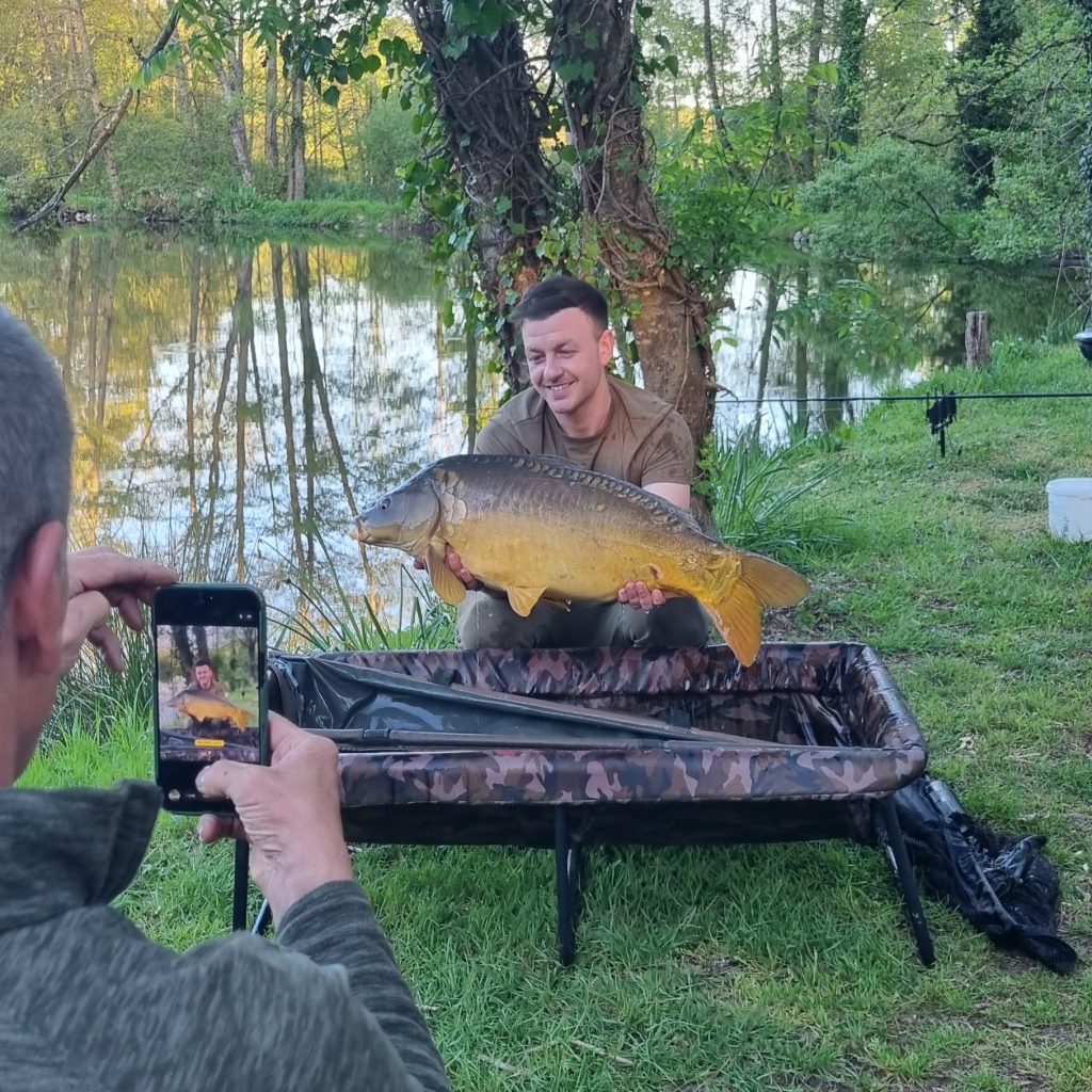 Having both lakes meant that they could spread out and fish a bit in both lakes if they wanted. On Sunday afternoon Will moved across to Lac Lucie and on Monday morning he had caught a 40lb mirror and 20lb mirror. We saw that he had a fish on in the afternoon and went down to see it reach the bank. Weighing in at 42lb 8oz, Will was feeling very pleased with himself.